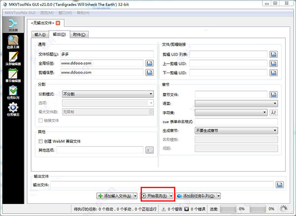 3、将文件添加完成后,对输出信息进行修改,最后点击“开始混流”即可。