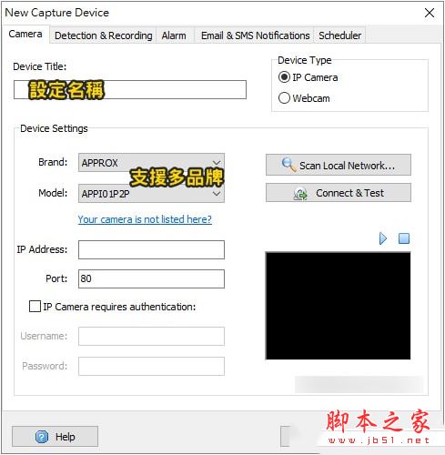 设定摄影机必须先设定一个名称,从下方Device Settings来选择摄影机的品牌与型号,支援的品牌非常的多,不过型号所有都有支援,若未支援的话可以询问官方看看。若不知道网路摄影机ip的话,可以透过Scan Local Network来寻找看看。
