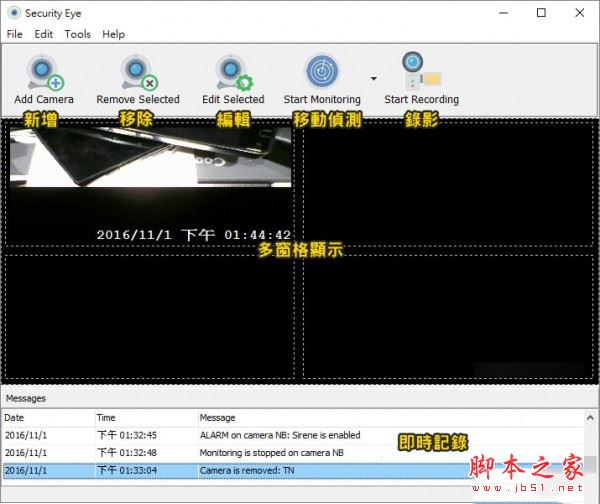 大致上的操作画面如上图,首先必须先新增摄影机,未来要编辑与移除的话,先选择摄影机之后点选工具列的移除或编辑即可。要使用移动侦测功能点选Start Monitoring就能设订单台或多台同时开启;Start Recording可以手动开始录影任务。