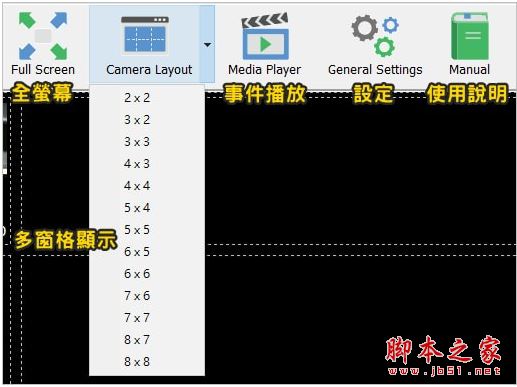监视系统支持多窗格的显示方式,最多可以支援到8 x 8一共64台摄影机,而且还是免费的!!!