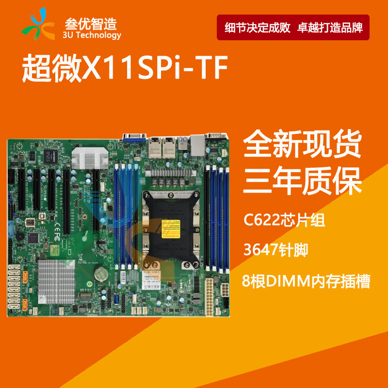 超微X11SPI-TF 主芯片组:Intel C622 CPU插槽:LGA 3647 内存类型:8×DDR4 DIMM USB接口:6×USB2.0接口(2个后部+ 4个接头),5×USB3.0接口(2个后置+2个接头+1个A型) 存储接口:10×SATA III接口 主板板型:ATX板型