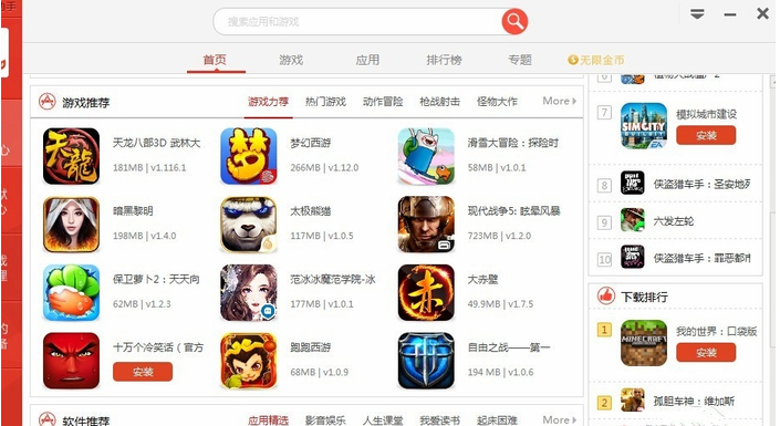 2、或是没有自己想要的应用,你可以在最上方的搜索框中输入想要的游戏名字,然后妲己放大镜一样的按钮或是敲击键盘上的回车键进行搜索。如果还是搜索不到,也可能是该助手工具中还没有收录,你可以将这个问题反映给官方客服解决。